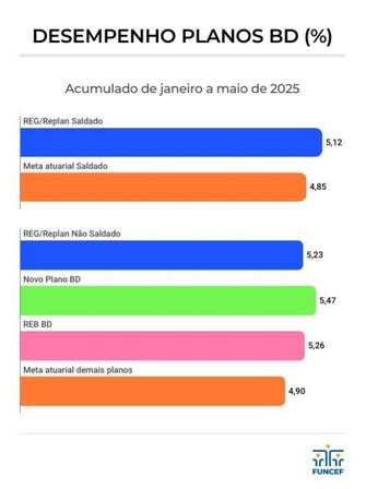 Os planos de Contribuição Definida seguem liderando os retornos em 2025. O Novo Plano CD e o REB CD obtiveram ganhos de 7,00% e 7,35% no acumulado de janeiro a maio, o equivalente a 133% e 139% do CDI no período, respectivamente. Esse desempenho supera com folga a rentabilidade média acumulada, tanto por planos CD de outros fundos de pensão (5,70%) quanto por fundos comparáveis de previdência aberta (6,60%), conforme dados da Consultoria Aditus e da Anbima (Associação das Entidades dos Mercados Financeiro e de Capitais).